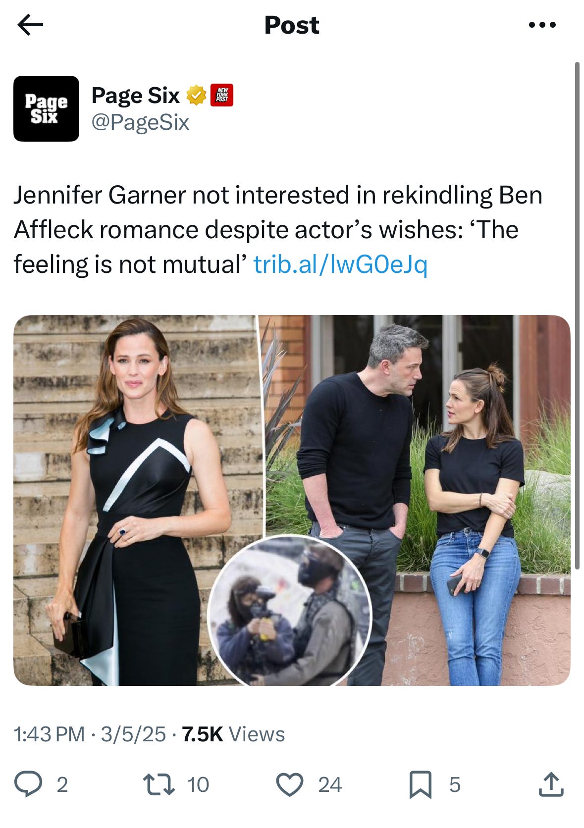 Second Jen slay of this issue (maybe this should be a recurring bit…?): Jen’s ex-husband/co-parent Ben Affleck was seen recently hugging her waist during a family ski trip which stirred online buzz about a possible rekindling of their past flame. Jen’s team took action quickly: