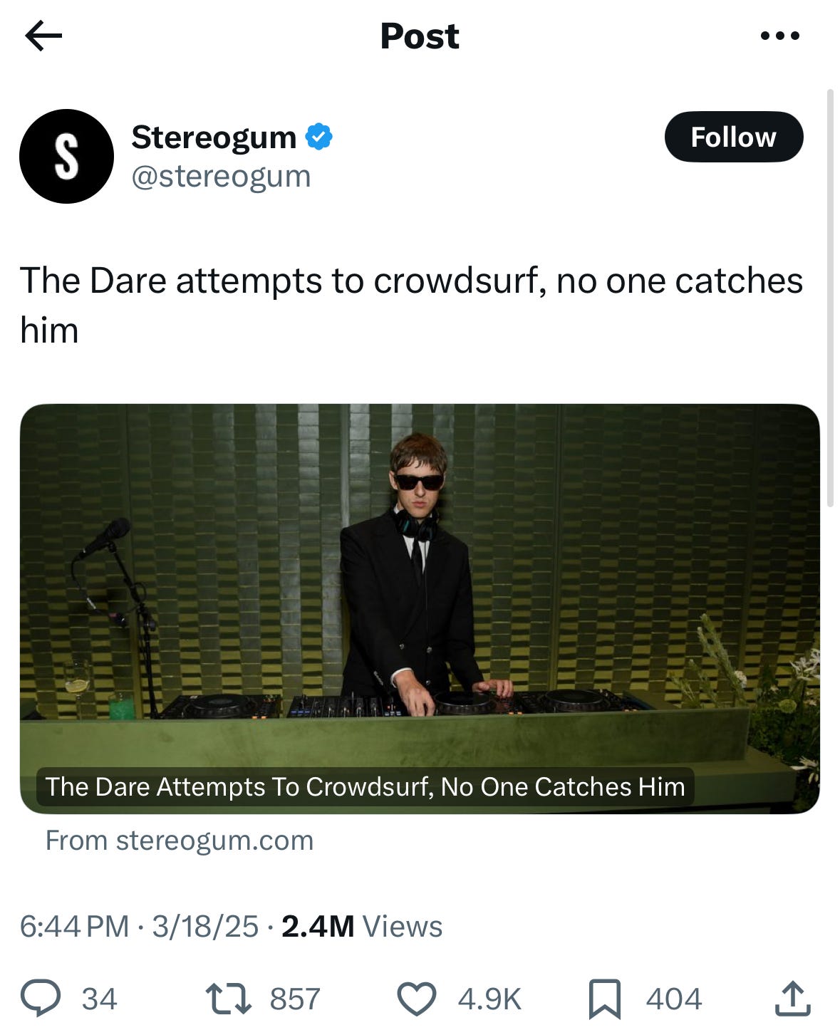 This Stereogum headline. Written by Danielle Chelosky, this is truly a legendary linguistic construction. You can read the entire play-by-play of The Blunder here.