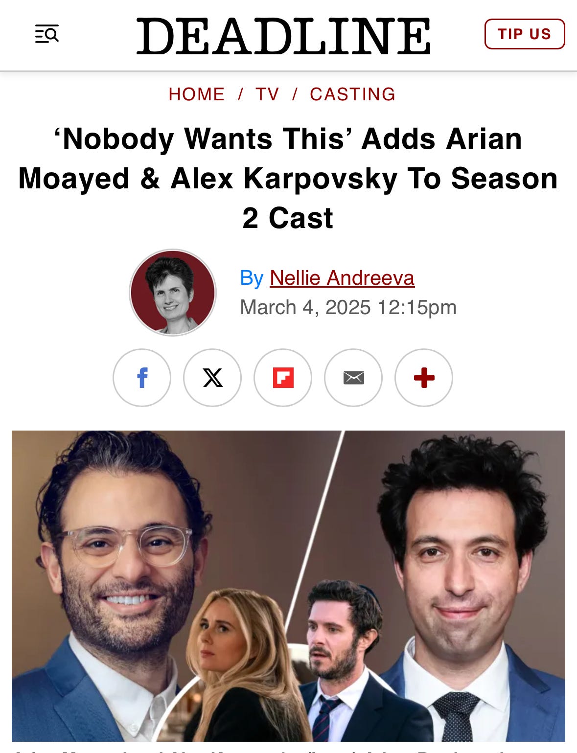 For those unfamiliar with any of the terms in this Deadline headline, I will decode. Nobody Wants This is the Kristen Bell x Adam Brody Netflix rom-com series that took the world by storm several months ago and had people thirsting over a hot rabbi played by none other than Adam Brody (my forever celeb crush). Arian Moayed played Stewy – Kendall Roy’s frenemy – on Succession, while Alex Karpovsky played Ray on GIRLS. Thus, this news benefits me in ways you couldn’t imagine. We’ll also see Moayed reunite with Justine Lupe, who played Willa on Succession and plays Morgan on Nobody Wants This. This show was already a huge win for me as the single rider on the Adam Brody train for years, but also seeing Timothy Simons (a.k.a. Jonah from VEEP) show off his comedic prowess has been a joy. Season 2 will also feature Brody’s wife Leighton Meester – previously stanned on SLEEPER HIT – so these casting decisions are starting to feel targeted. Towards ME.