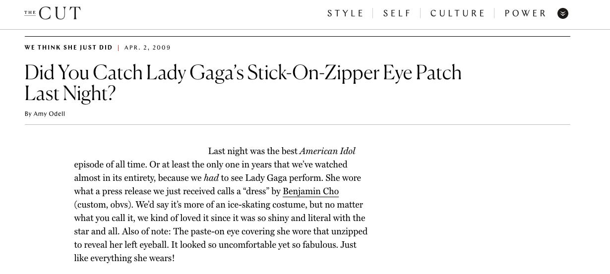The first time Gaga graced the stage of my mind, she donned a zipper pocket on her eyelid while performing. I never forgot it. Clearly, neither did many people.